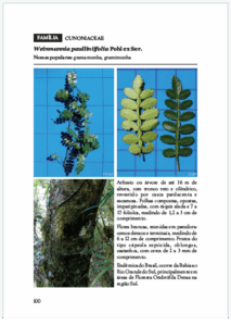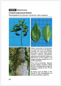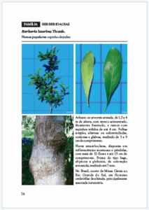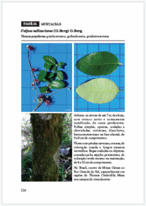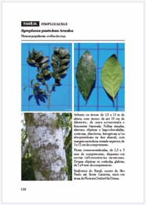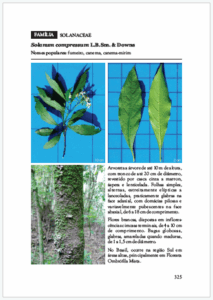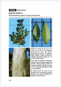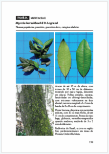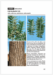 Cada espécie é apresentada em uma única página, com três fotografias e informações descritivas. A descrição inclui o nome científico atualmente válido, os nomes populares, a caracterização morfológica e a distribuição geográfica no Brasil.